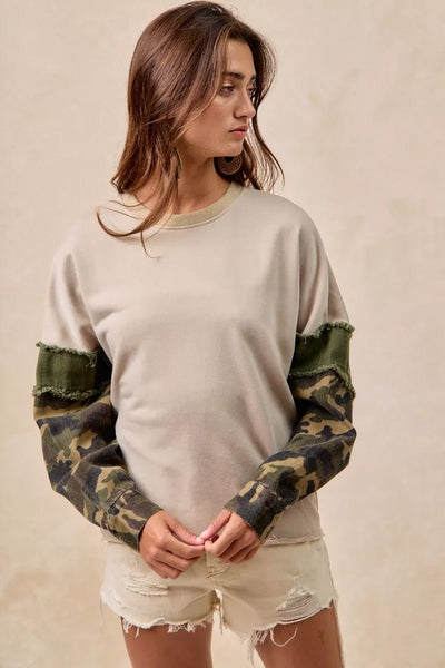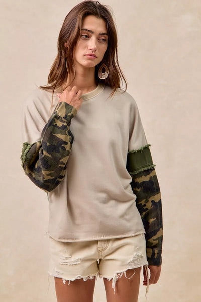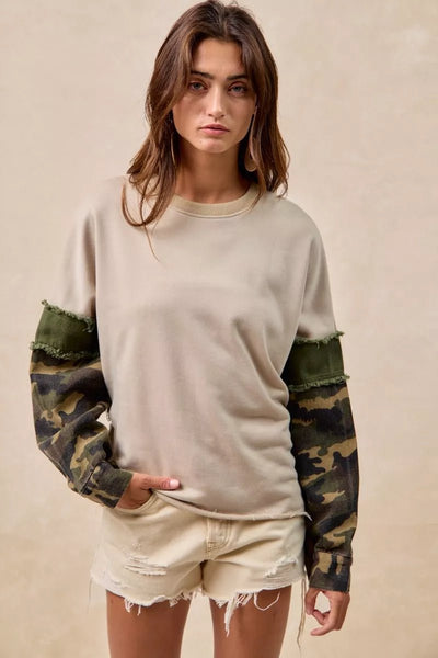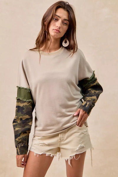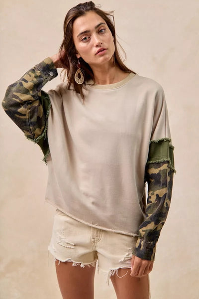 This French terry top features camo sleeves with a stylish and edgy twist. The frayed edge detailing adds a touch of rugged charm to the design. Perfect for a casual and trendy look, this top offers both comfort and style. The combination of French terry and camo sleeves creates a unique and eye-catching aesthetic. Stay on-trend with this top that effortlessly combines comfort and fashion-forward appeal.