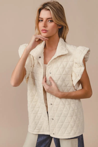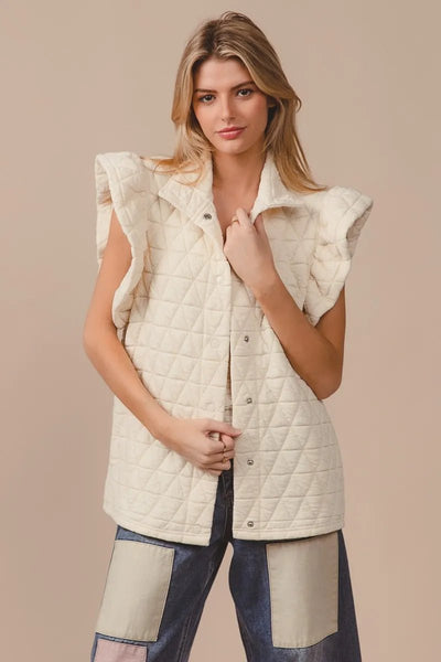 This stylish quilted vest coat features a classic diamond-pattern quilted design in a sophisticated cream color. Made from lightweight yet durable fabric, it offers the perfect layering solution for transitional seasons. The sleeveless design provides freedom of movement while the button-front closure and collared neckline add structured elegance. The relaxed fit silhouette flatters various body types and pairs effortlessly with both casual and semi-formal outfits. Perfect for adding texture and warmth without bulk, this versatile vest combines comfort with contemporary style.
