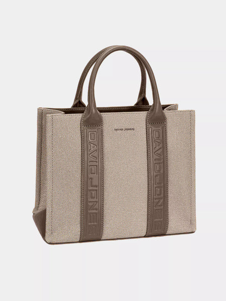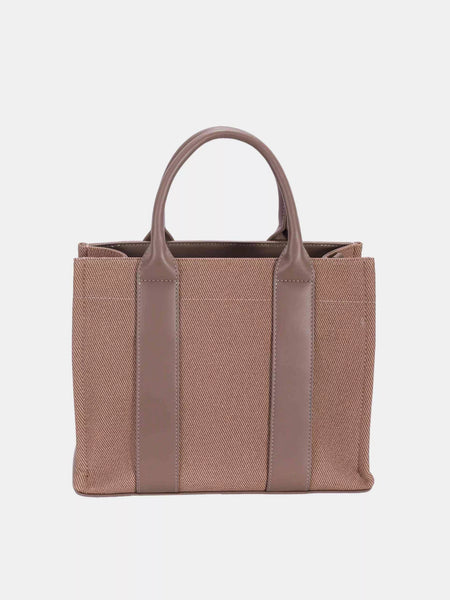 This sophisticated structured canvas handbag features premium brown canvas material with contrasting leather handles and trim. The bag showcases a professional rectangular silhouette with reinforced construction for durability. Logo-printed straps add brand recognition while the spacious interior makes it perfect for work, travel, or daily use. The neutral brown color palette ensures versatility with any outfit, while the sturdy double handles provide comfortable carrying options.