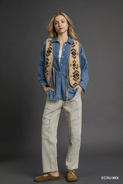 Stay stylish and cozy with this Mix Patterned Sherpa Tie-Front Vest. Made from soft sherpa fleece, it will keep you warm on chilly days. The front tie closures with striped trim add a trendy touch to the vest. Convenient front patch pockets provide storage for small essentials. Plus, it is lined for extra comfort and warmth.